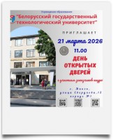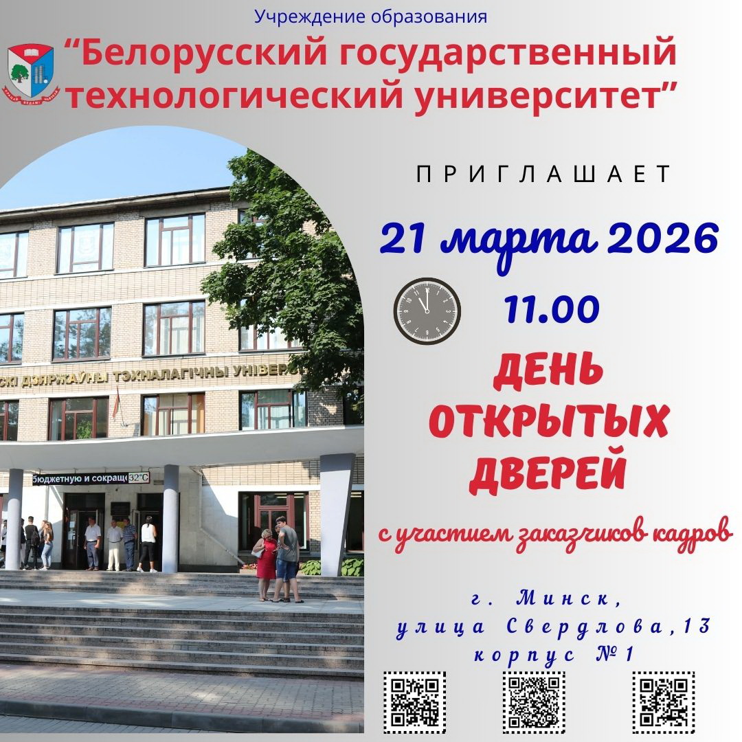 Белорусский государственный технологический университет приглашает 21 марта 2026 года абитуриентов и всех заинтересованных на День открытых дверей с участием заказчиков кадров. Адрес проведения: г. Минск, улица Свердлова, 13, корпус №1. Начало в 11:00.