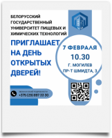 В учреждении образования «Белорусский государственный университет пищевых и химических технологий» (БГУТ, г. Могилёв, пр-т Шмидта, 3) для учащихся и их родителей 07.02.2025 с 10.30 до 12.30 (суббота) будет проходить «День открытых дверей» с приглашением представителей предприятий-заказчиков кадров!